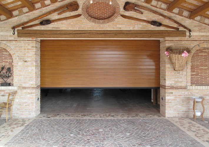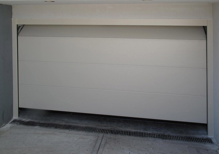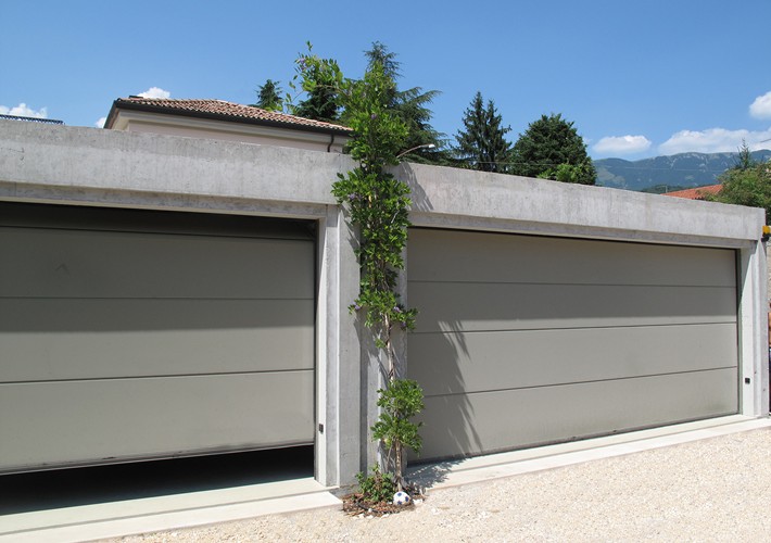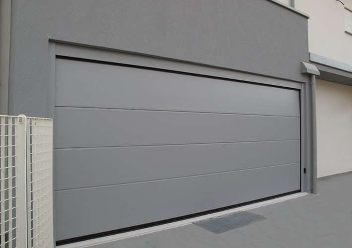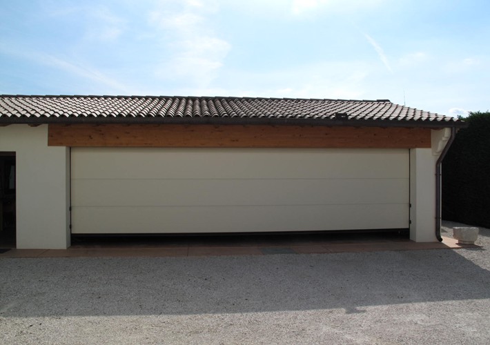 Portone sezionale costituito da pannelli coibentati da 42 mm in acciaio preverniciato in tinte RAL standard o in simil legno. Soluzioni anche con pannelli in alluminio con tamponamenti vetrati o aerati.