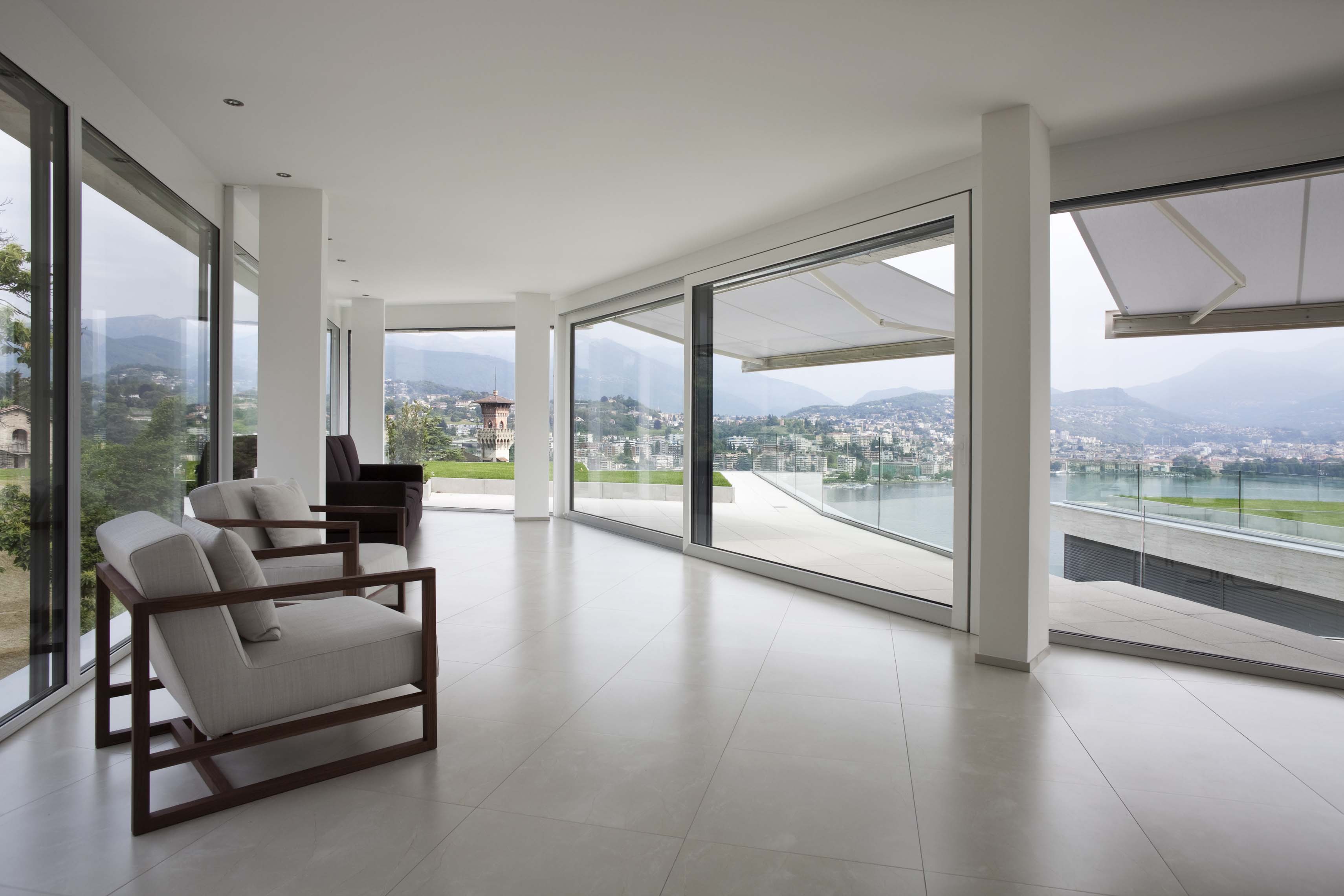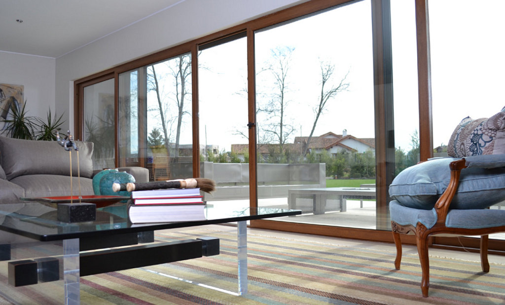 La soluzione eseguita di serie prevede l’utilizzo a pavimento di una soglia in alluminio a taglio termico da 20,5 mm dove scorrono le ante. Tale esecuzione è certificata per la tenuta all’aria e all’ acqua migliorando l’isolamento termico ed acustico.